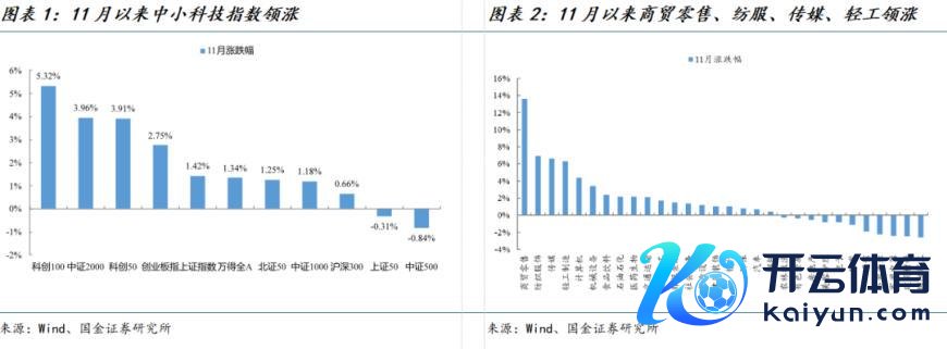 追念11月A股市集领路,阅历了月初的阶段性高涨后,市集遍全手下降至到26日才稍有止跌企稳迹象。数据浮现,适度11月28日A股主要宽基指数中,以科创100、中证2000、科创50为代表的中小科技指数高涨显著,月度环比永诀录得+5.32%/+3.96%/+3.91%;而中证500、上证50、沪深300等指数偏弱,月度环比永诀录得-0.84%/-0.31%/+0.66%。结构层面上,一级行业中涨幅靠前的行业包括商贸零卖、纺织衣饰、传媒、轻工制造、盘算机等,月度环比永诀录得13.59%、6.90%、6.65%、6.33%、4.39%;而国防军工、建筑材料、家用电公用事、通讯等行业则月度环比永诀录得-2.58%、-46%、-2.41%、-2.23%和-1.91%。从结构来看,11月 “特朗普上台”使得市集担忧营业风险进一步加重,议论板块承压下降,而关于“刺激内需”战略预期成为市集交游重心。此外,关于“破净股”议论战略出台也使其成为市集交游热门。