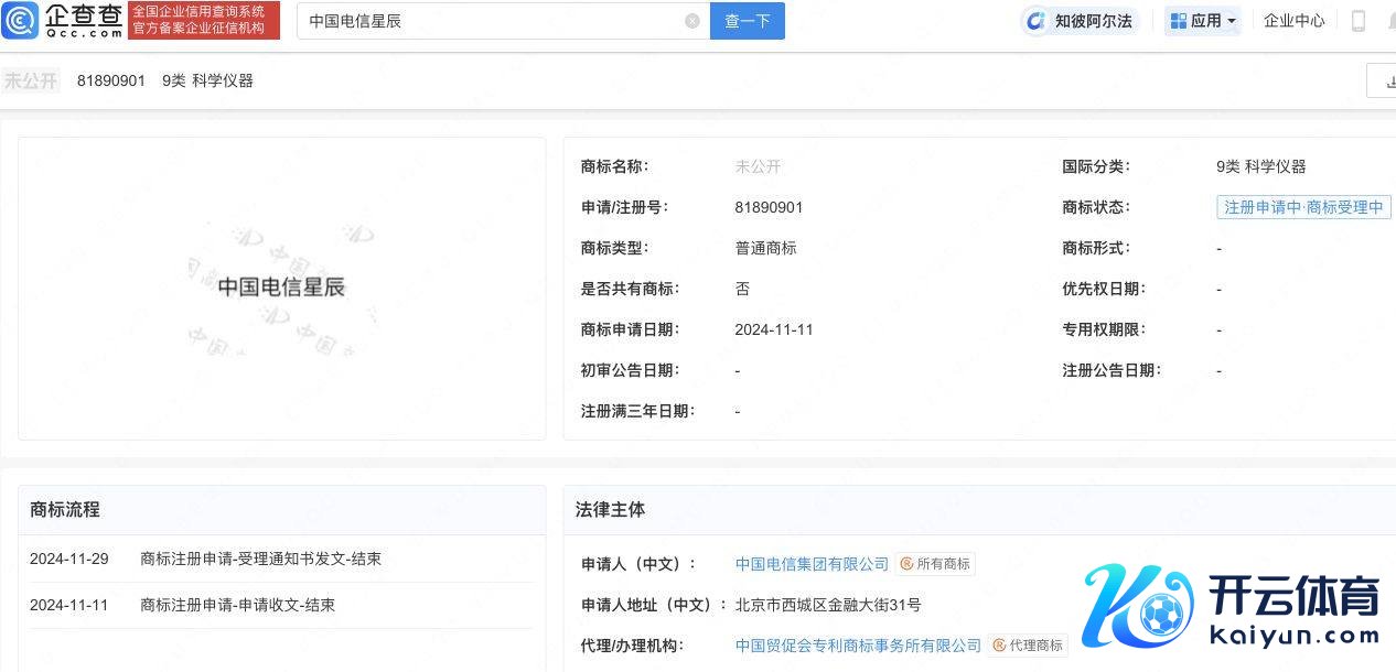 企查查APP露馅,近日体育游戏app平台,中国电信集团有限公司请求注册一枚“中国电信星辰”商标,国外分类为科学仪器,现在商标气象为注册请求中。