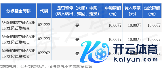 本站音书,2月22日华泰柏瑞基金解决有限公司发布《华泰柏瑞中证A50交游型敞开式指数证券投资基金发起式聚拢基金斥逐大额申购(含调度转入、按时定额投资)业务的公告》。公告中辅导,为保证本基金的认知运作,保护基金份额握有东谈主利益,以及把柄《华泰柏瑞中证A50交游型敞开式指数证券投资基金发起式聚拢基金基金条约》的关系轨则,自2025年2月24日起华泰柏瑞中证A50交游型敞开式指数证券投资基金发起式聚拢基金斥逐大额申购(含调度转入、按时定额投资)业务,申购、调度转入上限金额为10.0万元,下属分级基金颐养明细如下: