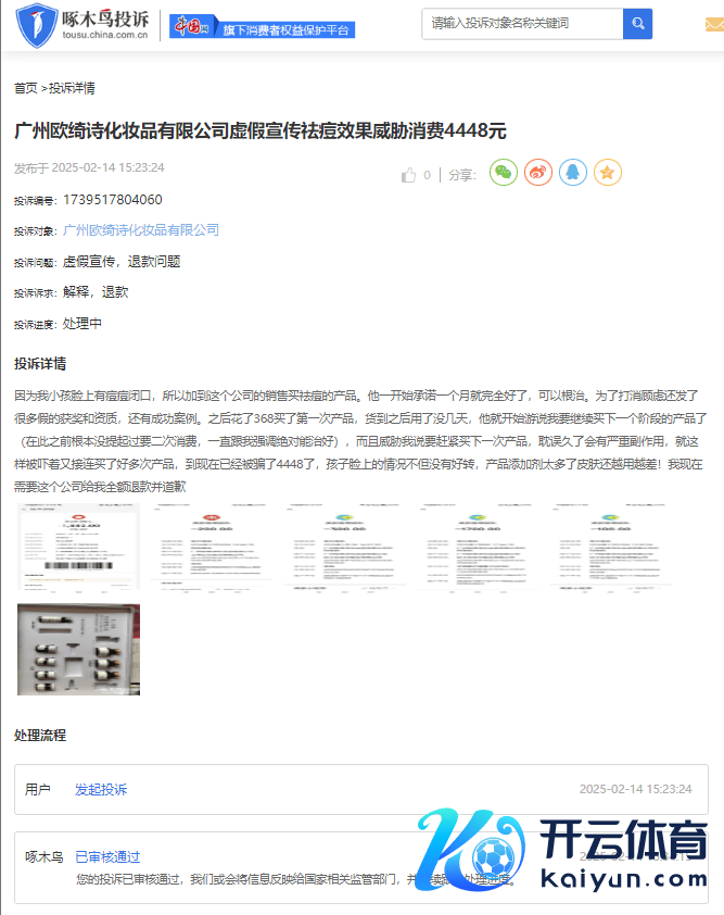 滥用者投诉称:“因为我小孩脸上有痘痘、钳口,是以我关连到广州欧绮诗化妆品有限公司的销售买祛痘的居品。销售东谈主员在一启动承诺,使用该公司居品一个月,痘痘就不错根治。为了拔除我的畏缩还发了好多失误的获奖文凭、专科天禀、以及调停告捷的案例。之后花了我368元第一次购买了居品。货到之后用了没几天,销售就启动游说我要继续买下一个阶段的居品了。在此之前,销售根蒂没拿起过要二次滥用,一直跟我强调皆备能治好。况兼催促我说,要赶快买下一次居品,迟误真切会有严重反作用。就这么我又接连买了好屡次居品,到目下一共滥用了4448元。孩子使用这款祛痘居品之后,脸上的情况不但莫得好转,皮肤反而还越用越差,我目下需要这个公司给我全额退款并谈歉。”